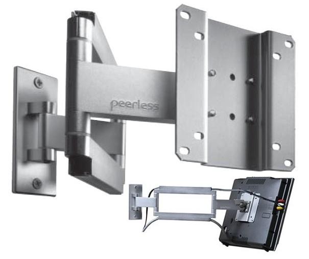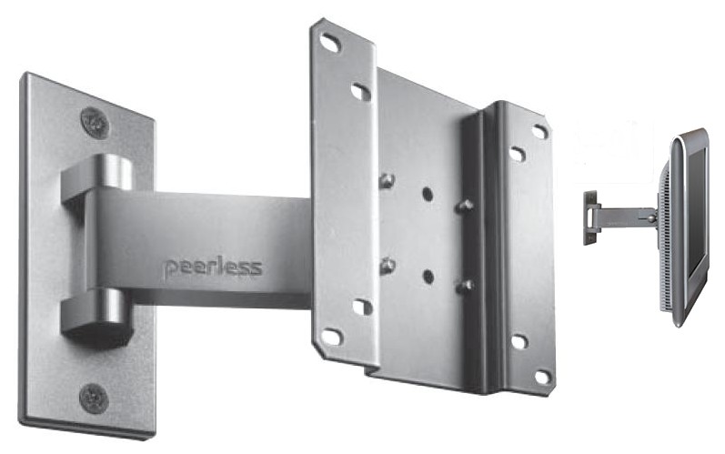 The Articulating Swivel Mount extends, swivels and tilts to provide multiple viewing options. It is ideal for commercial, educational and home theater applications. Mount the PLA-1 in a recessed wall or anywhere full mobility is needed. When retracted, the screen sits almost flush against the wall or the articulating arm can be extended to a maximum of 30.5". Three pivot points on the arm allow 180° swivel to create limitless viewing positions. Peerless’ exclusive manual leveling adjustment keeps the screen level (no tools required; a must-have for recessed installations where a screen that is not perfectly level is very noticeable). The 18" wall plate mounts to two studs with 16" centers (fasteners for wood stud included) or mounts to solid concrete or concrete block with appropriate fasteners (sold separately). Model-specific or Universal style PLP adapter plates are available to match your screen make and model, both are sold separately.