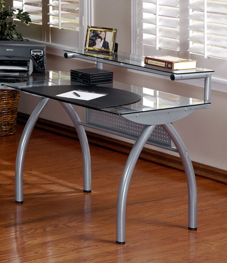 The Ellipse Computer Desk combines high-tech steel frame construction and tempered glass. Smooth out your workload with multiple shelves for storage and adjustability. Features: